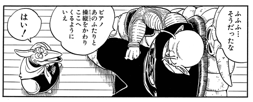 When Piccolo's newest creation Cymbal is killed by Yajirobe, Piano initially dismisses the idea that one of their wicked clan could lose, saying "How could there possibly be anyone in this world able to defeat one of us...?" Piccolo immediately accepts the situation, however, and bellows out "Then how, pray tell, did Cymbal die?!!!" in rage.