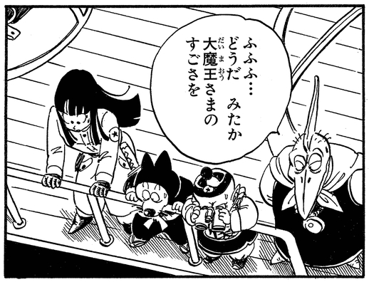 Enraged as the deaths of his demonic offspring, Piccolo vows to destroy this new enemy himself and orders that their flying base be taken to where they were slain. Piano and the Pilaf Gang stay aboard the ship while his master fights Goku, and Piano calmly states "Now do you see the greatness of the lord Demon King?" when Piccolo quickly overwhelms Goku with a shocking show of evil power.