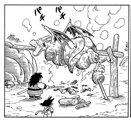 Meat is drawn to look so yummy in Dragon Ball... Also, you really don't see people eating their foes much in any other series. (Laughs) I mean, they were just talking to that guy a minute ago! But when I was in elementary school I didn't think anything of it; I just thought it looked delicious.