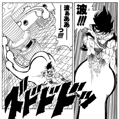 Ikezaki: I also love the part in the story where Goku is training in the Gravity Room on his spaceship while traveling to Planet Namek. He fires off a barrage of Kamehamehas and deliberately tanks them head-on to push himself to the brink of death, then heals back up with a Senzu Bean to get even stronger! I can't remember seeing over the top things like that in any manga other than Dragon Ball.