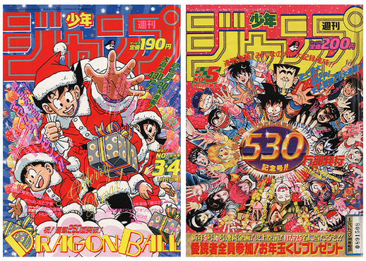 Goku continued to make appearances on the covers of Shonen Jump, such as on the left here where he helped celebrate Christmas in a Santa suit, or on the right where the Saiyan appeared in the center to celebrate 5.3 million copies of the magazine sold!