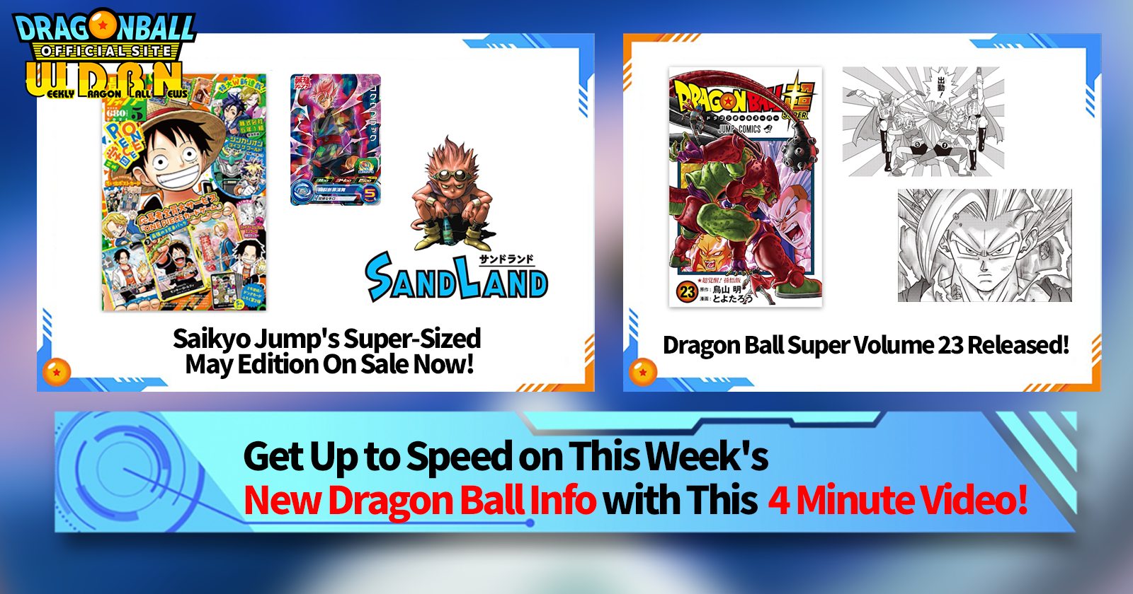 "Weekly Dragon Ball News" is a video series updated every Monday (JST) to bring you the latest news in the world of Dragon Ball! Join V Jump editor Victory Uchida as he covers all the hottest info released in the previous week as well as fresh updates like new product info and site news for the week to come!