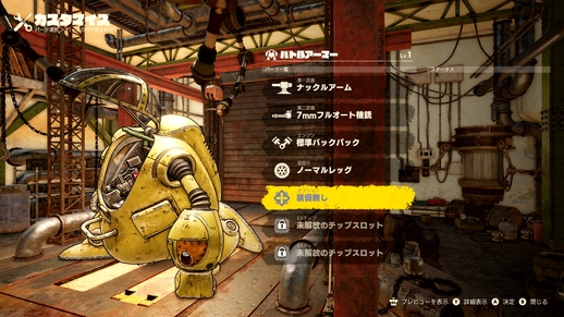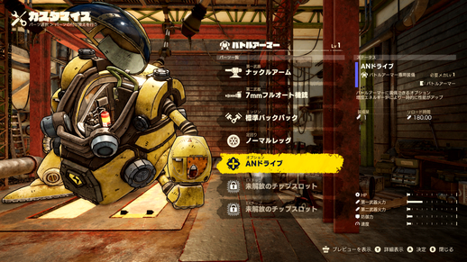 In the Garage, you can use the parts you've collected to customize your vehicles! Equip an optional AN Drive to a Battle Armor in normal mode to give it a stylish makeover in addition to changing its abilities!