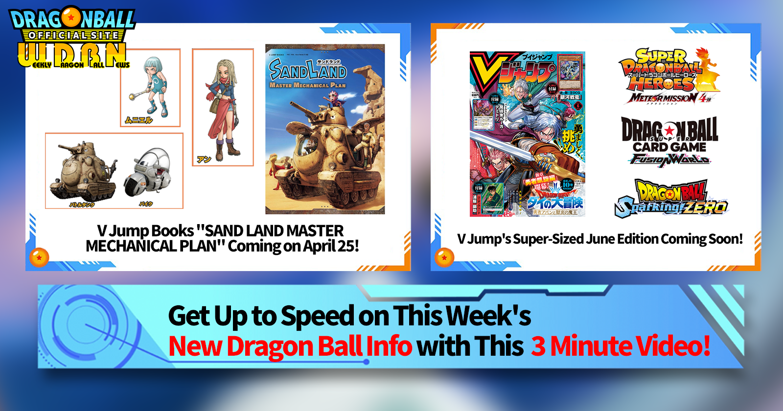 "Weekly Dragon Ball News" is a video series updated every Monday (JST) to bring you the latest news in the world of Dragon Ball! Join V Jump editor Victory Uchida as he covers all the hottest info released in the previous week as well as fresh updates like new product info and site news for the week to come!