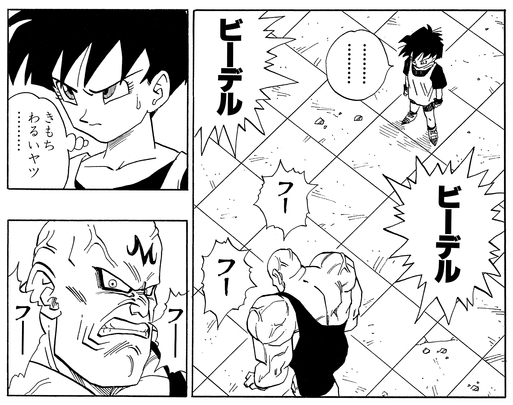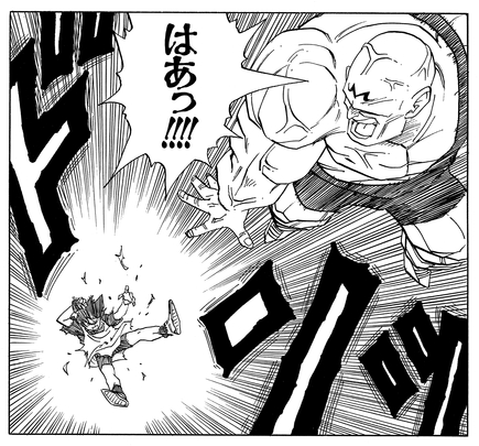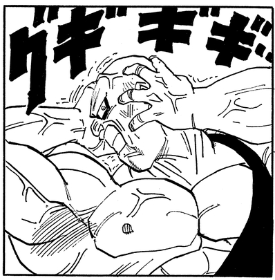 He tanks Videl's onslaught of attacks, and despite taking what should be critical damage, seems completely unfazed. He even gets his neck broken by a kick that spins his head completely around, but eerily fixes it by snapping it back into place using his unnatural strength.