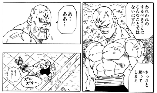The brutal giant seems determined to continue until he gets reprimanded by his partner Yamu, who scolds him by saying "This isn't what we set out to do." Uttering only "Oh yeah..." in response, Spopovich then finally drags Videl out of the ring to end the fight.