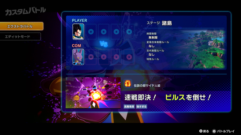 The "Extra Battle" that I played was one where I played as Vegeta and had to fight to keep Beerus from getting bored! In this battle, if you don't deal 20% damage to Beerus every 30 seconds, the feline God of Destruction will warn you that he's getting bored. Then, if you don't inflict damage for another 10 seconds, Beerus will declare that he is too bored to continue the battle and cause the battle to end with one ultra powerful move! This battle was super difficult!