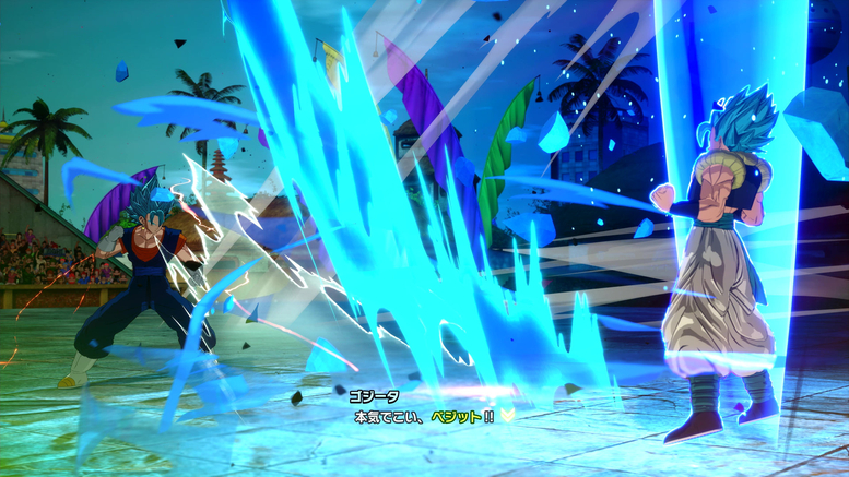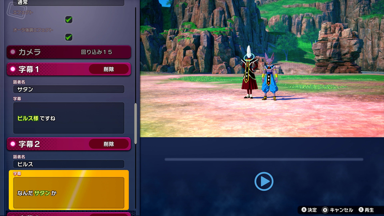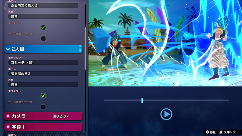 Here, you can configure the camerawork, poses, and expressions used when characters enter the arena. In the scene shown here, Vegito has done a backflip to get some distance and is now at the ready, while Gogeta is gathering Ki to provoke him!