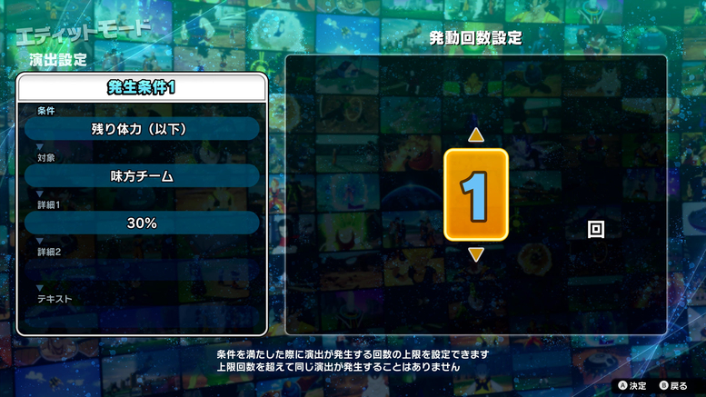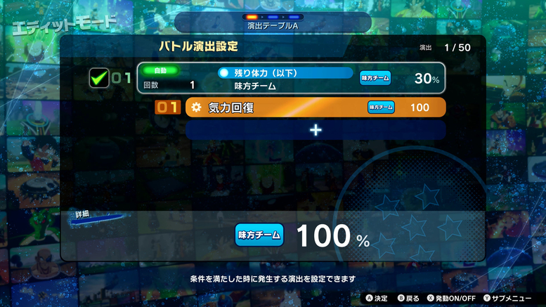 You can configure the characters, battle environment, and even the things that happen when certain conditions are met! As you can see in the photos below, when the allied team's remaining health falls below 30%, their Ki will reach 100%!
