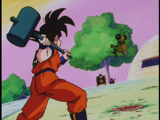 After giving Gregory a light tap with the hammer, Goku asks, "That wasn't too bad, was it, Gregory?"