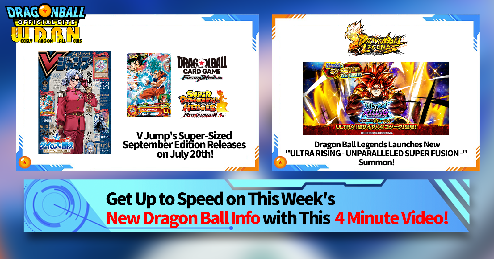 "Weekly Dragon Ball News" is a video series updated every Monday (JST) to bring you the latest news in the world of Dragon Ball! Join V Jump editor Victory Uchida as he covers all the hottest info released in the previous week as well as fresh updates like new product info and site news for the week to come!