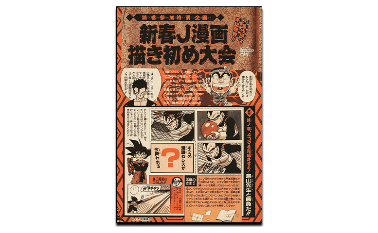 In this announcement for the "New Year's Drawing J Manga Contest", Vegeta was depicted aiming for a strike at a bowling alley in the first three panels. While Toriyama had his own idea on how the fourth panel would play out, it was up to participants to bring their own ideas to the table and draw the final panel for themselves!