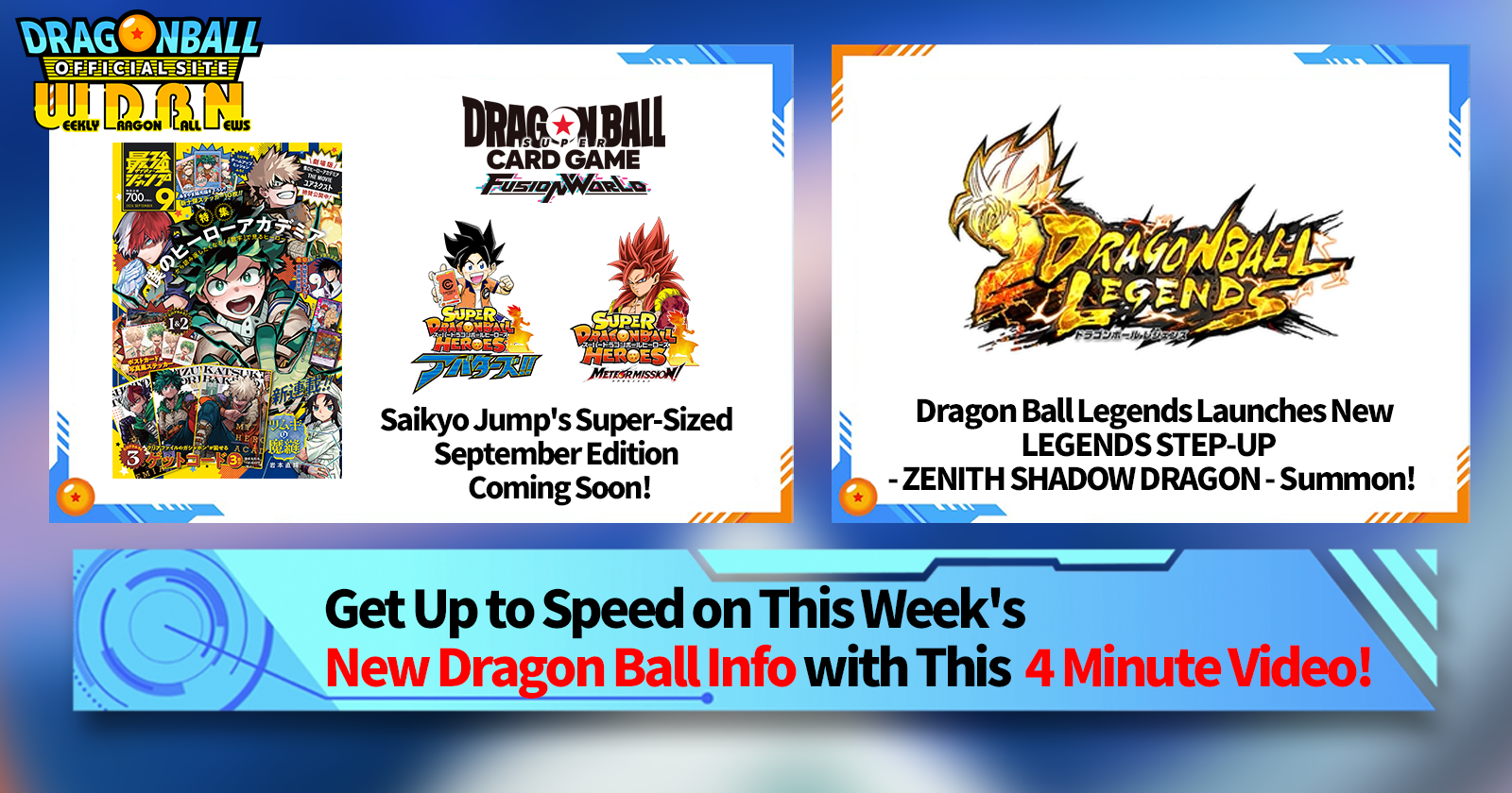 "Weekly Dragon Ball News" is a video series updated every Monday (JST) to bring you the latest news in the world of Dragon Ball! Join V Jump editor Victory Uchida as he covers all the hottest info released in the previous week as well as fresh updates like new product info and site news for the week to come!