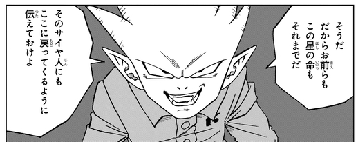 Later, Shimorekka heads to Earth to rescue the captured Macareni Siblings. However, he shocks the siblings by stating, "Traitors acting on their own are dispensable." However, Shimorekka is stopped by Piccolo before he can eliminate the three!