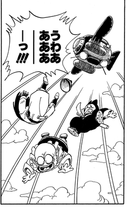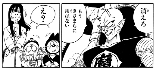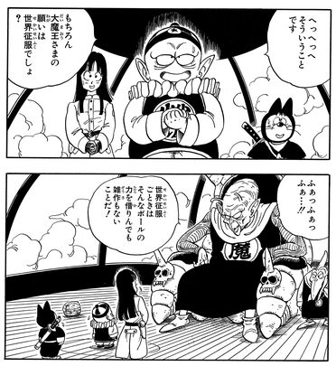 After the Great Demon King gets his youth restored by the Dragon Balls, Pilaf finally musters up the courage to ask, "Regarding our previous agreement...J-Just how m-much of the world do you think you would be willing to bequeath us...?". However, the villainous Piccolo simply responds, "BEGONE. I have no more use for you." and throws Pilaf and his crew right off of the Flying Base!