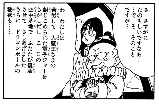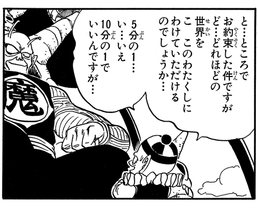 Despite having revived the Great Demon King Piccolo, tiny Pilaf is actually terrified of him! In his initial negotiations Pilaf suggests, "W-We were wondering if you would graciously bestow half of the world upon us... heh heh heh...". He quickly walks that back after taking one look at the Great Demon King Piccolo's face, saying "Um...of course, if half is too much... W-W'd be fine with a third. A fourth, even!!"