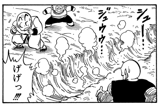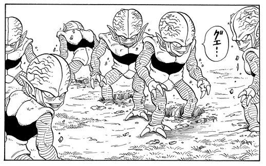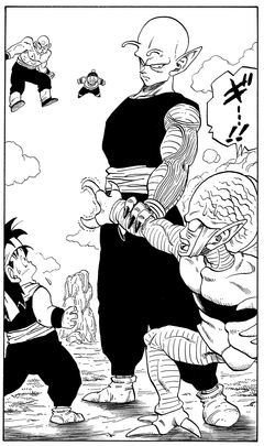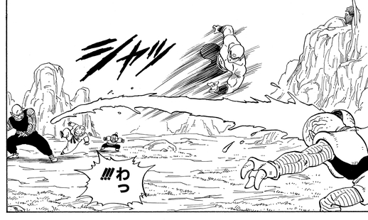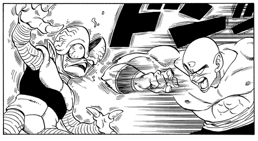 The first one counters Tenshinhan's attack by blasting acidic liquid out of its head, but Tenshinhan dodges the blast!
