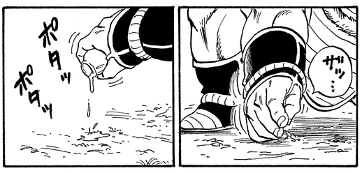 However, one Saibaiman manages to escape Krillin's attack and attacks Gohan! Luckily, it is spotted and blown away by Piccolo!