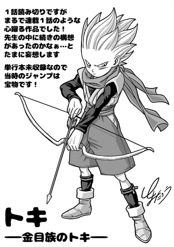 Toki is the protagonist of Akira Toriyama's one-shot manga "KINTOKI: Toki of the Kinme Clan", which was published in Weekly Shonen Jump 2010 No. 50! Toki is part of the Kinme clan, all of whom have golden eyes and extraordinary physical abilities. This one-shot follows his adventures looking for a marriage partner so he can keep his clan from disappearing!