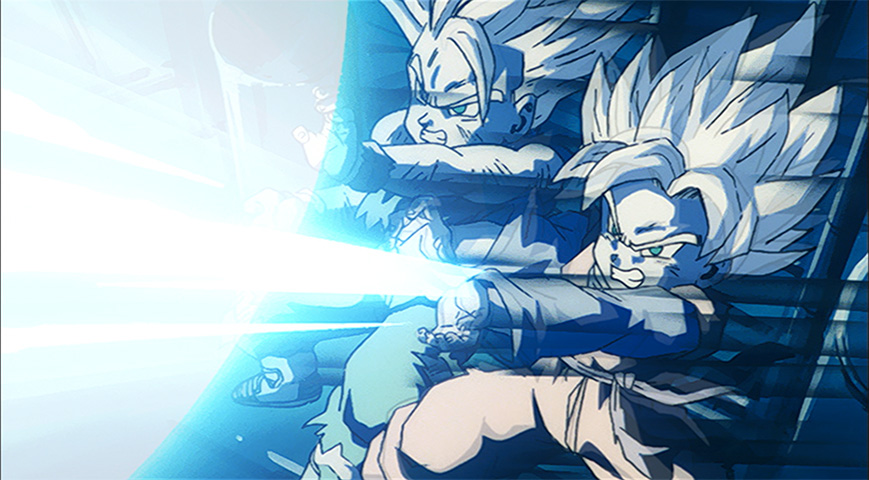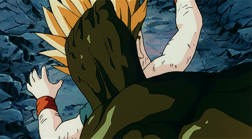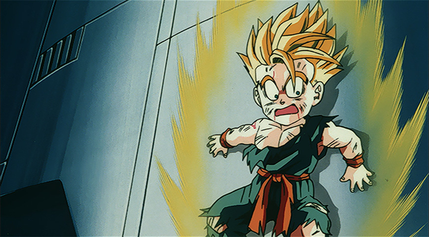 Goten and Trunks transform into Super Saiyans and attack Bio-Broly with a flurry of attacks in an attempt to defeat him.