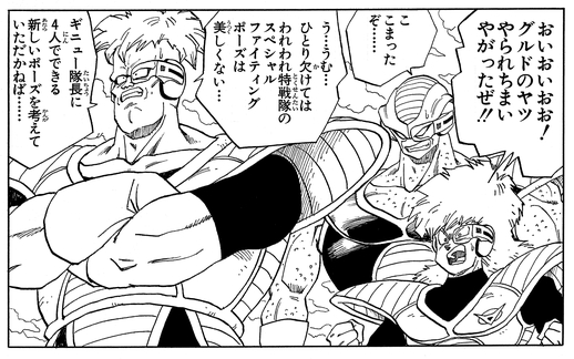 Having lost a thrilling round of rock-paper-scissors, Burter is forced to sit back and watch as Guldo and Recoome face off against Vegeta and the others.