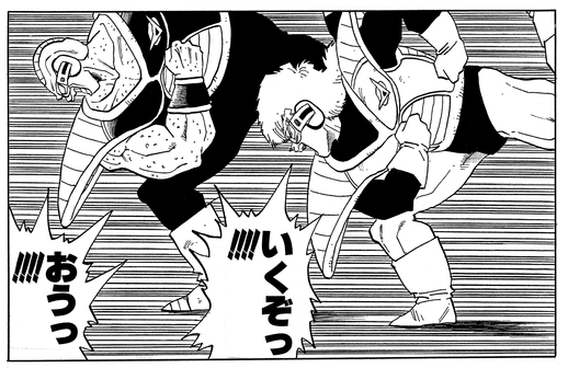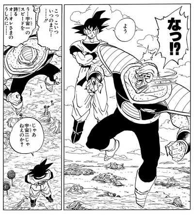 With his superior speed, Goku is able to catch Burter off guard and slip behind him. In response to Burter's boasts of being the fastest in the universe, Goku mockingly replies, "Maybe you used to be."