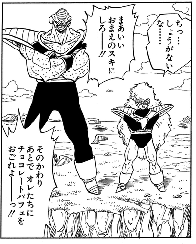 Angered by this, Recoome demands, "Lemme do the two shrimps too, okay?!" to which Burter fires back, "Oh, fine, do what you want!! But you'll have to treat us to chocolate parfaits later!" Just by looking at him, you'd never guess Burter could be so saccharine!