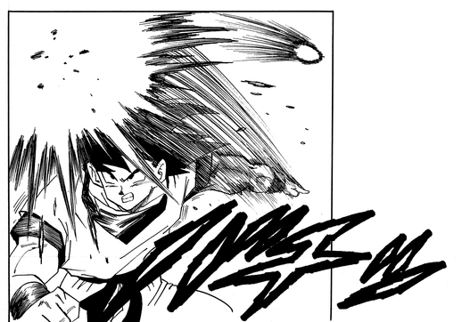 The low Power Level indicated by Jiece's Scouter leads him to think Goku will be easy pickings, but instead he finds himself unable to land a single attack on the Saiyan and is sent flying from the force of Goku's Ki alone!