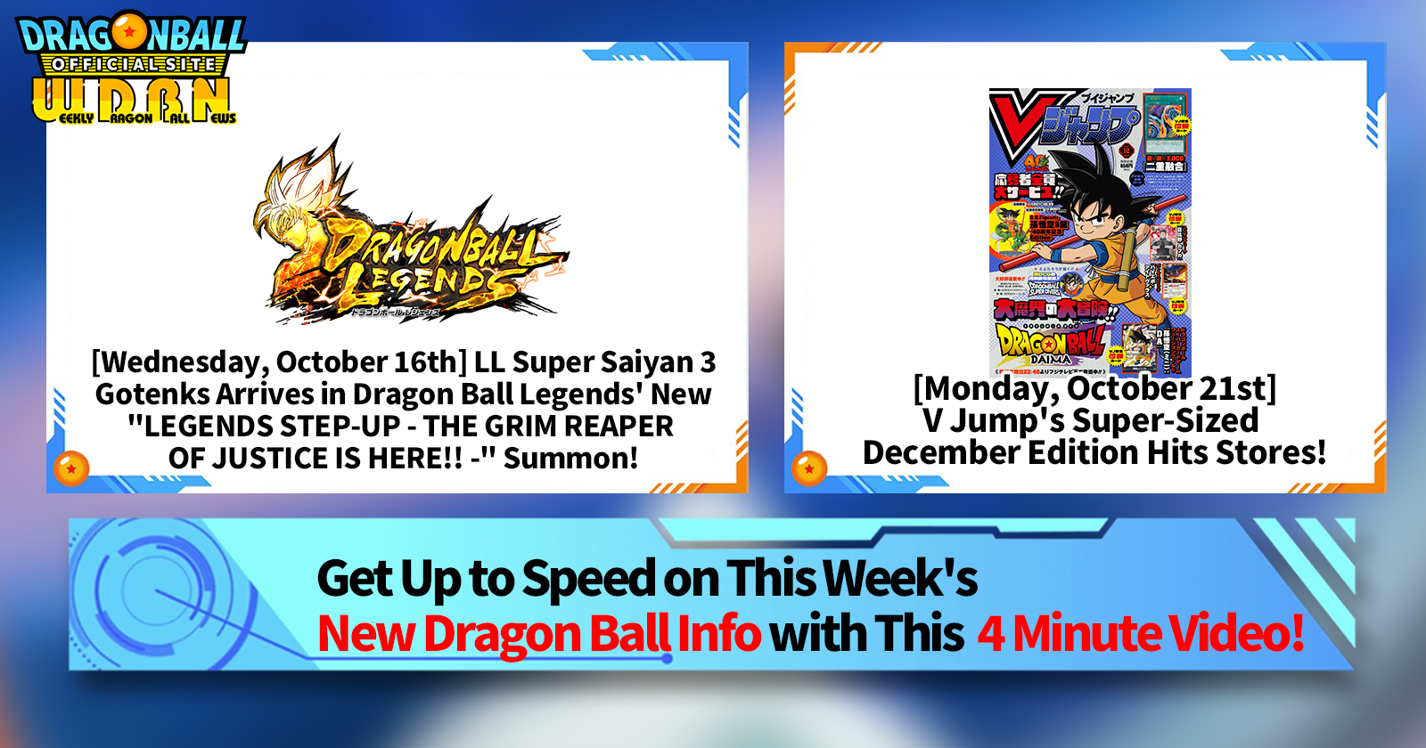 "Weekly Dragon Ball News" is a video series updated every Monday (JST) to bring you the latest news in the world of Dragon Ball! Join V Jump editor Victory Uchida as he covers all the hottest info released in the previous week as well as fresh updates like new product info and site news for the week to come!