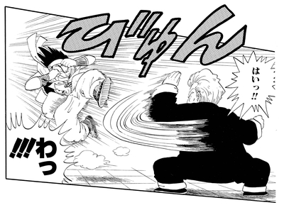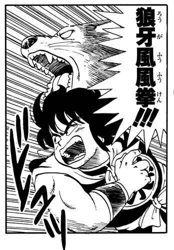 One such band of unlucky travelers to encounter the dastardly desert duo was Goku and friends on their quest for the Dragon Balls. In the resulting scuffle between Yamcha and Goku, Yamcha came out on top by unleashing his fearsome Roga Fufu-Ken (Wolf Fang Fist) technique!