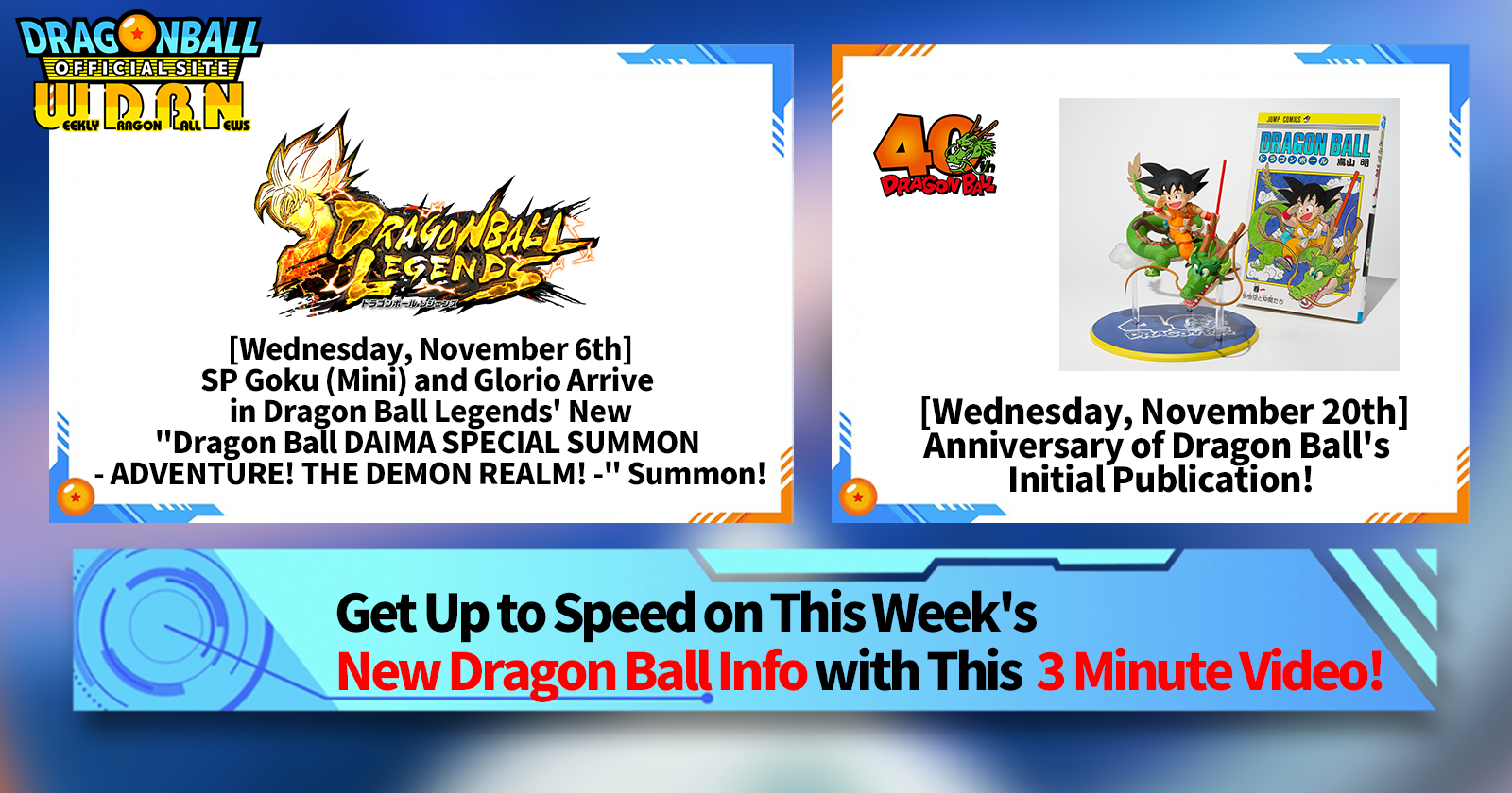 "Weekly Dragon Ball News" is a video series updated every Monday (JST) to bring you the latest news in the world of Dragon Ball! Join V Jump editor Victory Uchida as he covers all the hottest info released in the previous week as well as fresh updates like new product info and site news for the week to come!