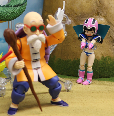 Here's Chichi as a young girl going on the attack against Kamesennin, saying, "My dad's real master oughtta be able to dodge this..."!