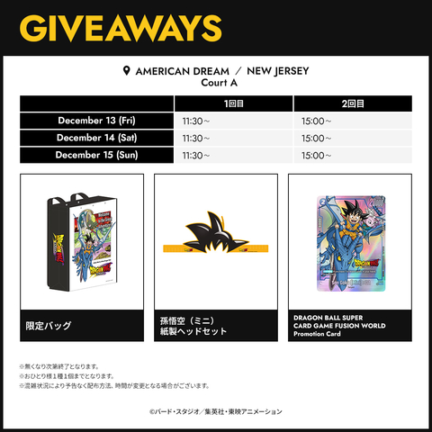 Get a Dragon Ball DAIMA limited-edition bag and headband, plus a DRAGON BALL SUPER CARD GAME Fusion World promo card just for coming to the venue!