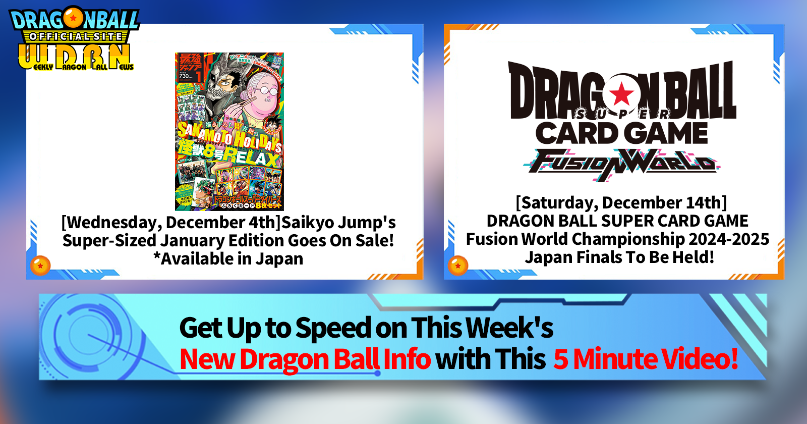 "Weekly Dragon Ball News" is a video series updated every Monday (JST) to bring you the latest news in the world of Dragon Ball! Join V Jump editor Victory Uchida as he covers all the hottest info released in the previous week as well as fresh updates like new product info and site news for the week to come!