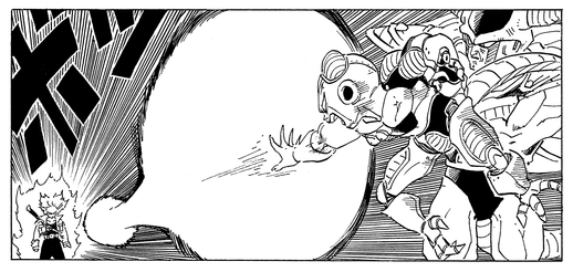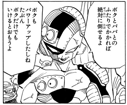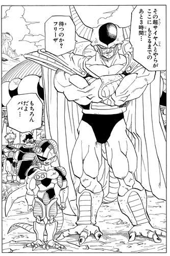 Despite seeing Trunks tear through his underlings in seconds, Frieza remains supremely confident, saying, "The half-strong die first. An old lesson that you'll have to learn the hard way." However, he is shocked when Trunks reveals his nature as a Super Saiyan.