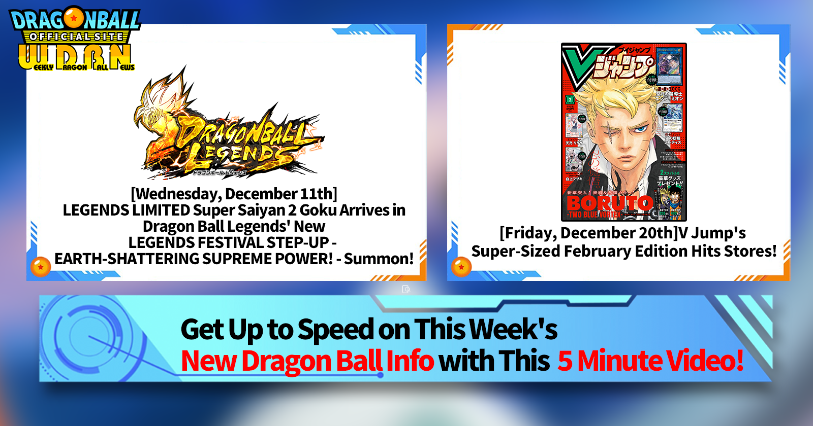 "Weekly Dragon Ball News" is a video series updated every Monday (JST) to bring you the latest news in the world of Dragon Ball! Join V Jump editor Victory Uchida as he covers all the hottest info released in the previous week as well as fresh updates like new product info and site news for the week to come!