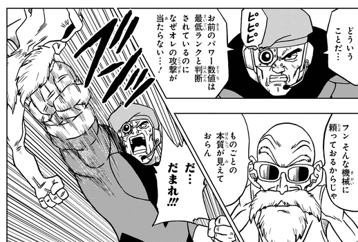 The device on Kahseral's right eye has scouter-like capabilities, allowing him to measure Kamesennin's Power Level during the Tournament of Power. However, Kamesennin's low Power Level proved to be misleading, and Kahseral was unable to perceive the master's skilled techniques clearly.
