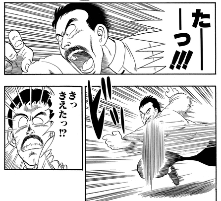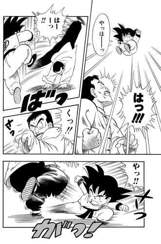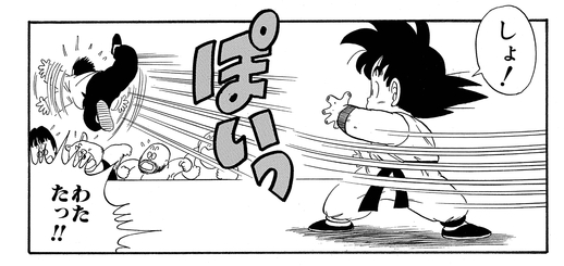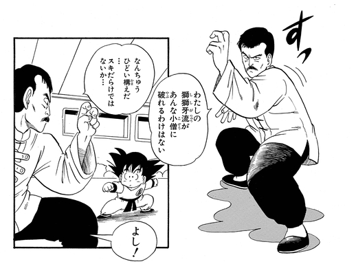 It turns out Goku had leapt into the air! The fighter quickly dodged the young warrior's airborne attack, only to find himself taken off balance after being kicked in the foot. Wasting no time, Goku flung the mustachioed martial artist out of the ring with little effort.