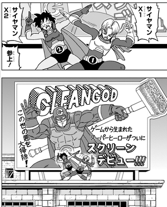 Here's a preview that was published in V Jump's super-sized March edition. In front of Trunks and Goten stands their favorite hero, Cleangod?! As a superhero who should exist only within a game, what has transpired for him to appear so prominently?