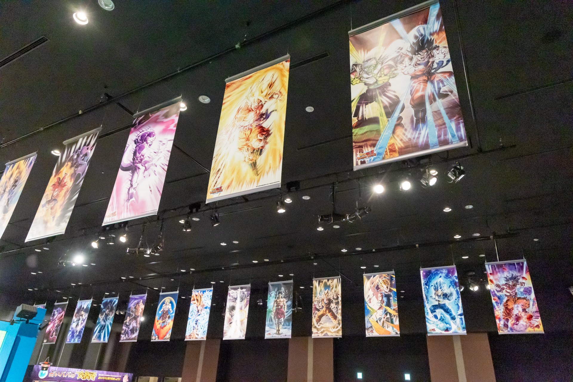 An array of banners featuring character illustrations lined the hall's ceiling.