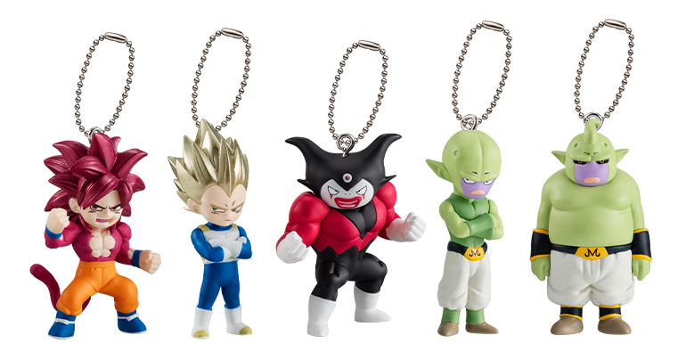 The lineup features five different characters, all featured in Dragon Ball DAIMA's climactic battle: Super Saiyan 4 Goku (Mini), Super Saiyan Vegeta (Mini), Third Eye Gomah, Majin Kuu, and Majin Duu!