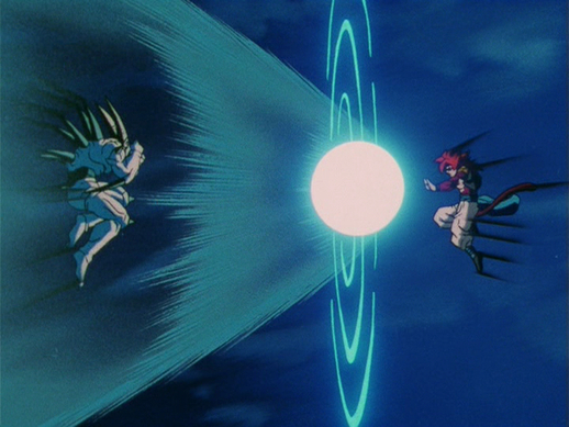 An enraged Yi-Shinron then fires a massive Power Ball of condensed Negative Energy. But in kicking the ball away from the Earth, Gogeta adds a helping of his own Positive Energy. The ball explodes, dispelling the dark miasma cloaking the world.