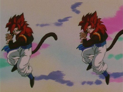A bewildered Yi-Shinron shouts, "Where are the other two?" in response to Gogeta suddenly appearing in Goku and Vegeta's place, with Gogeta responding, "The Saiyans? They're here. I am they; we are one. Unfortunately for you, Omega!" before sending the dragon flying with just a flash of his eyes.