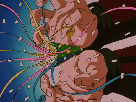 Gogeta splits into five apparitions and makes to fire five separate Kamehamehas at once...but he chooses to tease Yi-Shinron by firing off five party poppers instead.