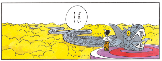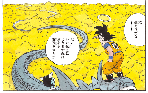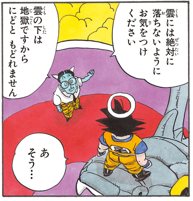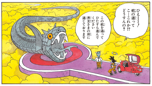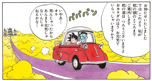 The Ogre Guide shows off his mischievous side when he asks the recently departed Goku, "Are you in good health?" Also, when Goku starts flying across the Serpent Road using the Buku-jutsu (Levitation Technique), the ogre can't help but mutter to himself, "That's not fair..."