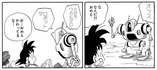 The robot greets Goku with a lazy "Greetings". Then, when Goku explains he wants to head north, he simply replies, "Then go". When Goku complains about the cold, he is uncaring, saying, "Given that I am a robot, I must conclude that it is just you". And when Goku asks why it's so cold, he coolly explains that "Atmospheric temperatures decrease in northern latitudes". Despite this, the robot's final words are "I seem to be frozen".