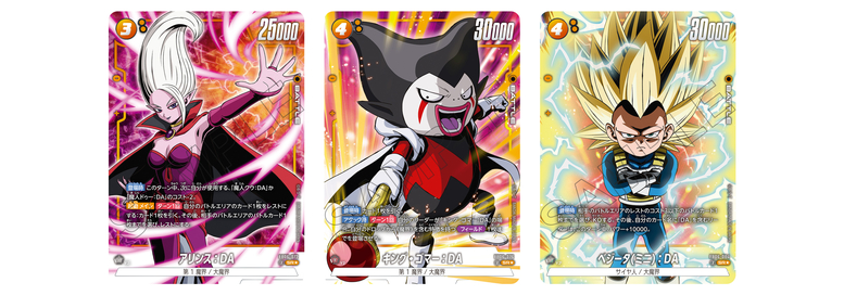 The "Yellow" SR Alt-Art cards in this set feature "Dr. Arinsu: DA", "King Gomah: DA", and "Vegeta (Mini): DA" from Dragon Ball DAIMA!