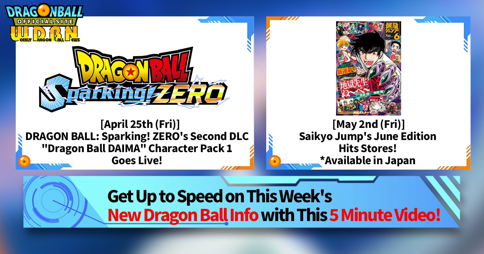"Weekly Dragon Ball News" is a video series updated every Monday (JST) to bring you the latest news in the world of Dragon Ball! Join V Jump editor Victory Uchida as he covers all the hottest info released in the previous week as well as fresh updates like new product info and site news for the week to come!