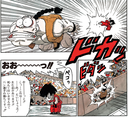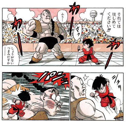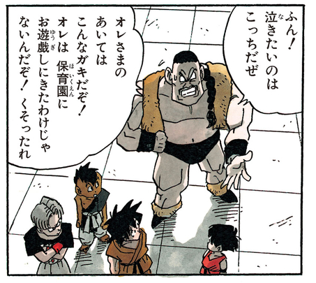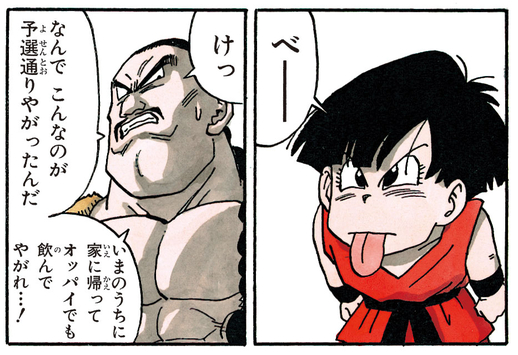 In the first round, he was disappointed to see that he was up against Pan and mocked her, saying, "For combat I came here! Not kindergarten!"