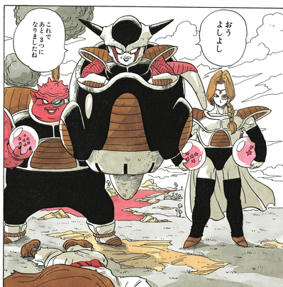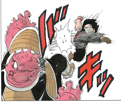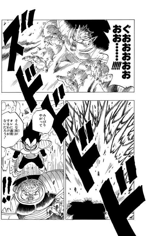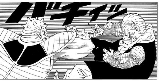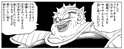 Vegeta manages to twist the brute's arms from behind. Dodoria pleads for his life, saying, "I-If you let me go, I-I'll tell you a secret...!!" and revealing that it was Frieza who destroyed Planet Vegeta, the Saiyan's home planet.
